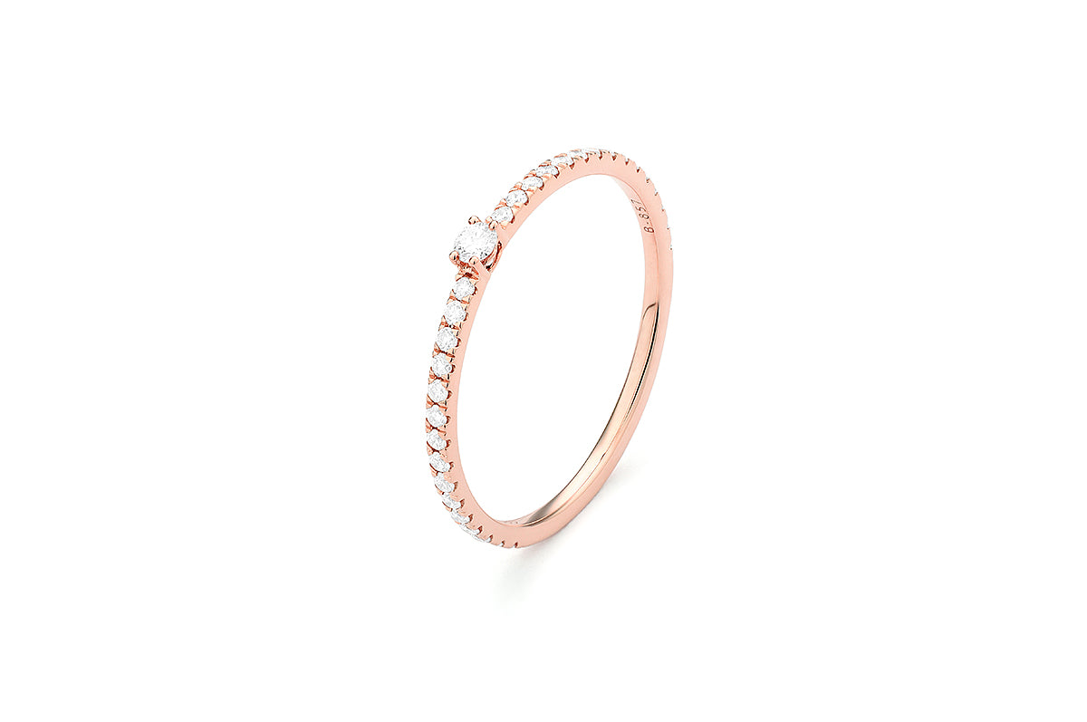 This contemporary 14K rose gold stackable diamond ring features a round center diamond with a total of 0.35 ctw SI diamonds.