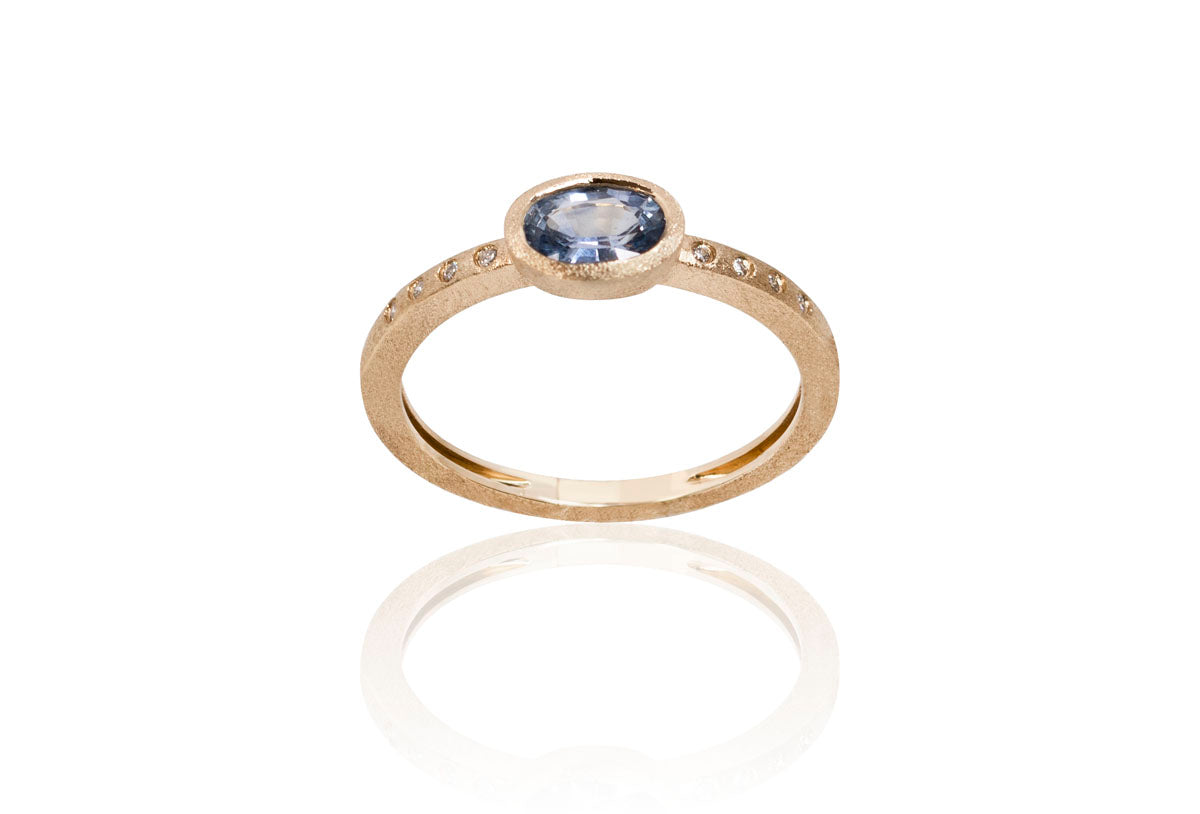 This 14k satin brushed gold ring features a center blue sapphire stone totaling 0.60 cts in a Bezel setting with burnish set diamond accents totaling 0.03 cts.