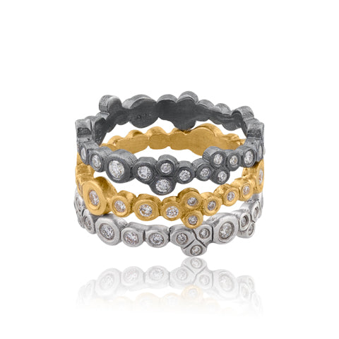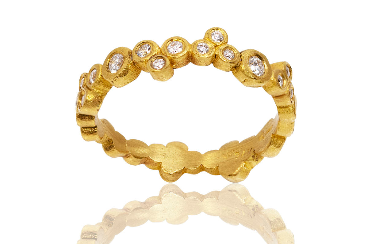 A Lika Behar design. A trademark design of this Turkish designer who uses an ancient roman pounding technique to create this 22K gold stackable band with diamonds. This contemporary 22K yellow gold stackable eternity band features 0.35 ctw of bezel diamonds.