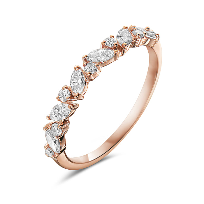 This elegant and modern diamond ring is crafted in 14k rose gold and features an intricate design with alternating marquise and round diamonds.