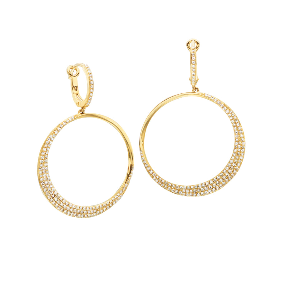 These shimmering crescent moon shape drop earrings are set in 14K yellow gold and are encrusted with sparkling 1.10 cts diamonds.