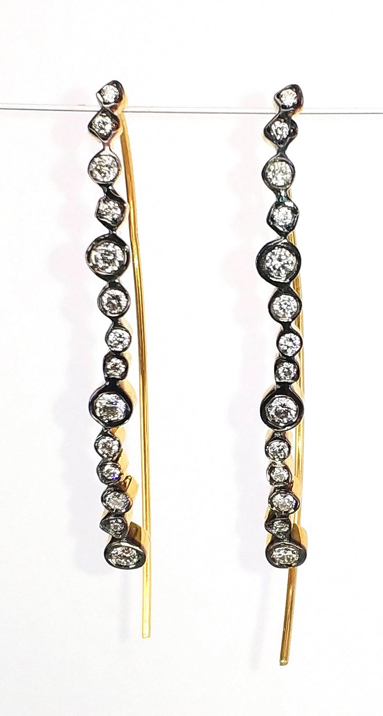 Make a fashion statement with these scintillating diamond and black rhodium threader earrings. Fashioned in 14k yellow gold with black rhodium and graduated bezel-set diamonds.