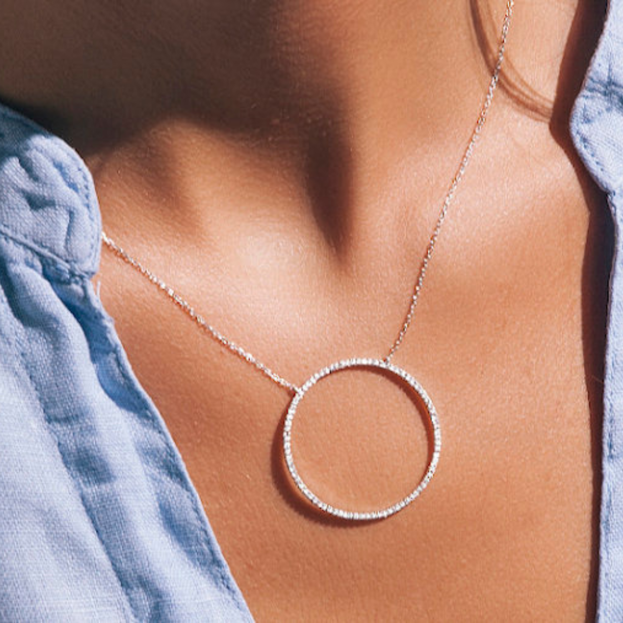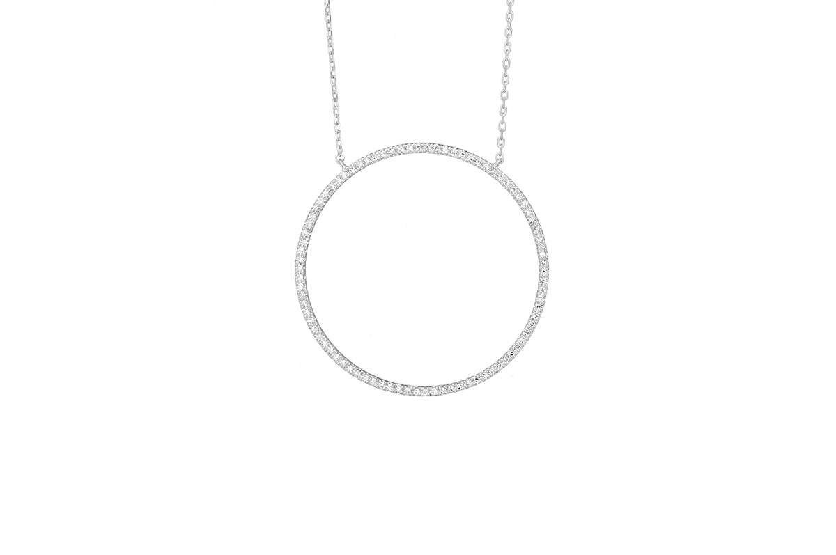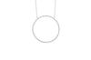 This contemporary 14K white gold diamond pendant features sparkling diamonds around the perimeter of the open circle design.
