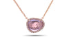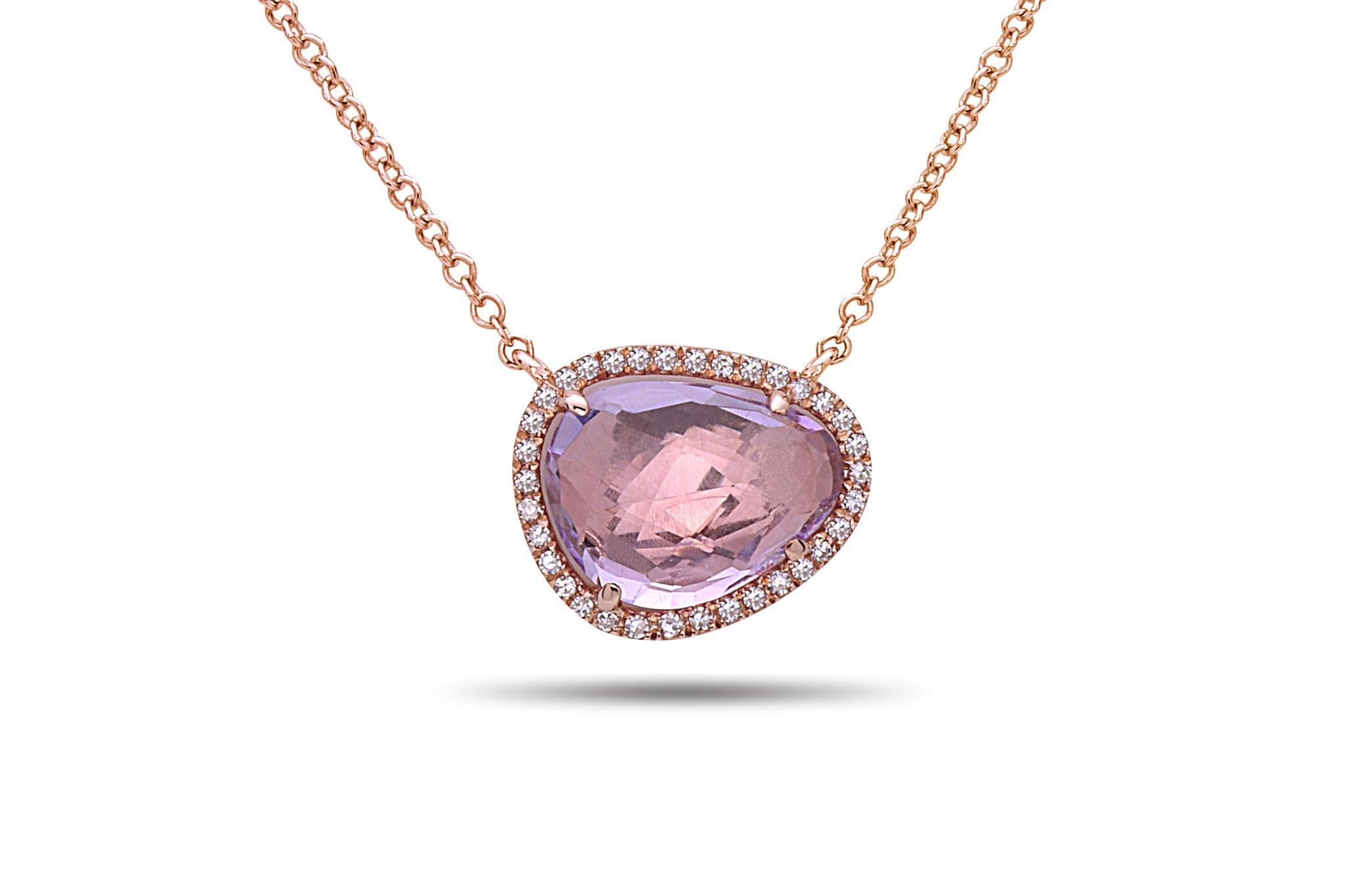 Surrounded by a glittering halo of diamonds, this glimmering rose cut bean topaz pendant is set in 14k white gold and features 1.75 cts amethyst and 0.08 cts diamonds.