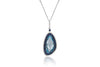 This mesmerizing pendant, crafted in 14k white gold is highlighted by an alluring blue topaz gemstone. The exquisite design is accentuated by shimmering sapphires, and a glimmering diamond halo.
