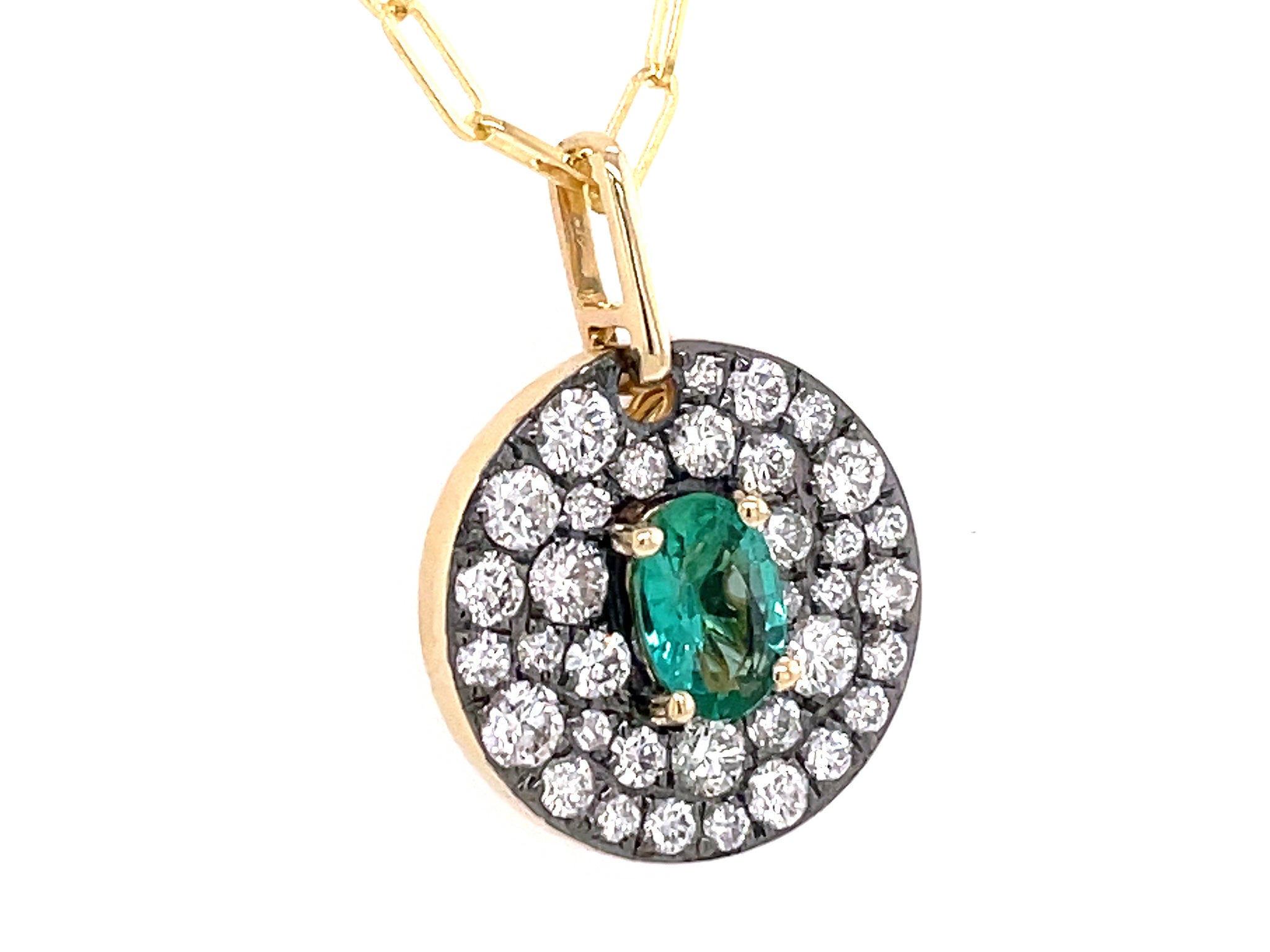 This stunning 14k oval emerald and diamond disc pendant features black finish diamond prongs, which highlight the brilliance of the diamonds. This pendant elegantly hangs from a gold paperclip chain.