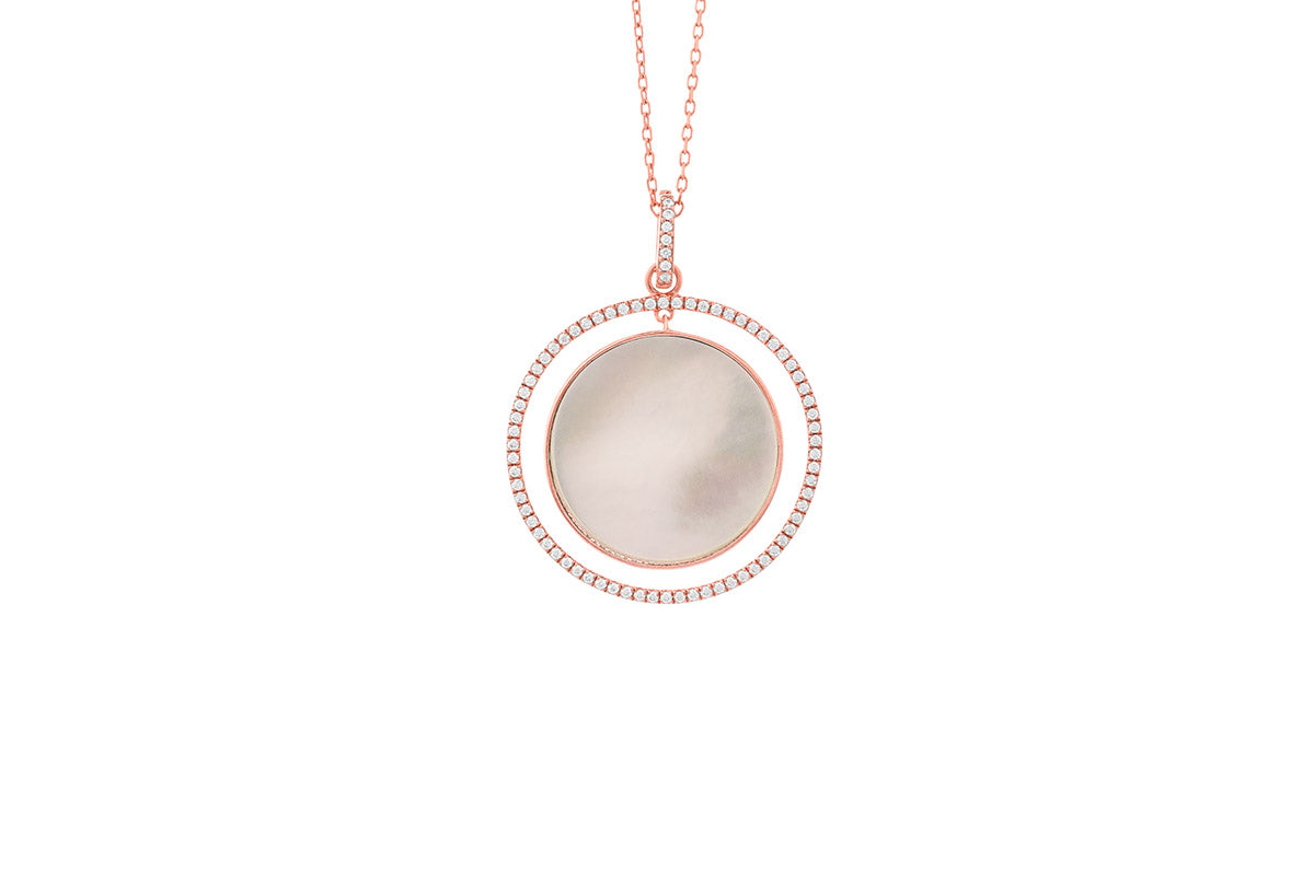 This luminous mother of pearl disc pendant exhibits a classic elegance. Crafted in 14k rose gold, It features an intricate design with a halo of diamonds.