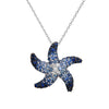 This unique, contemporary 14k white gold starfish pendant features different shades of glimmering blue sapphires and white diamonds.