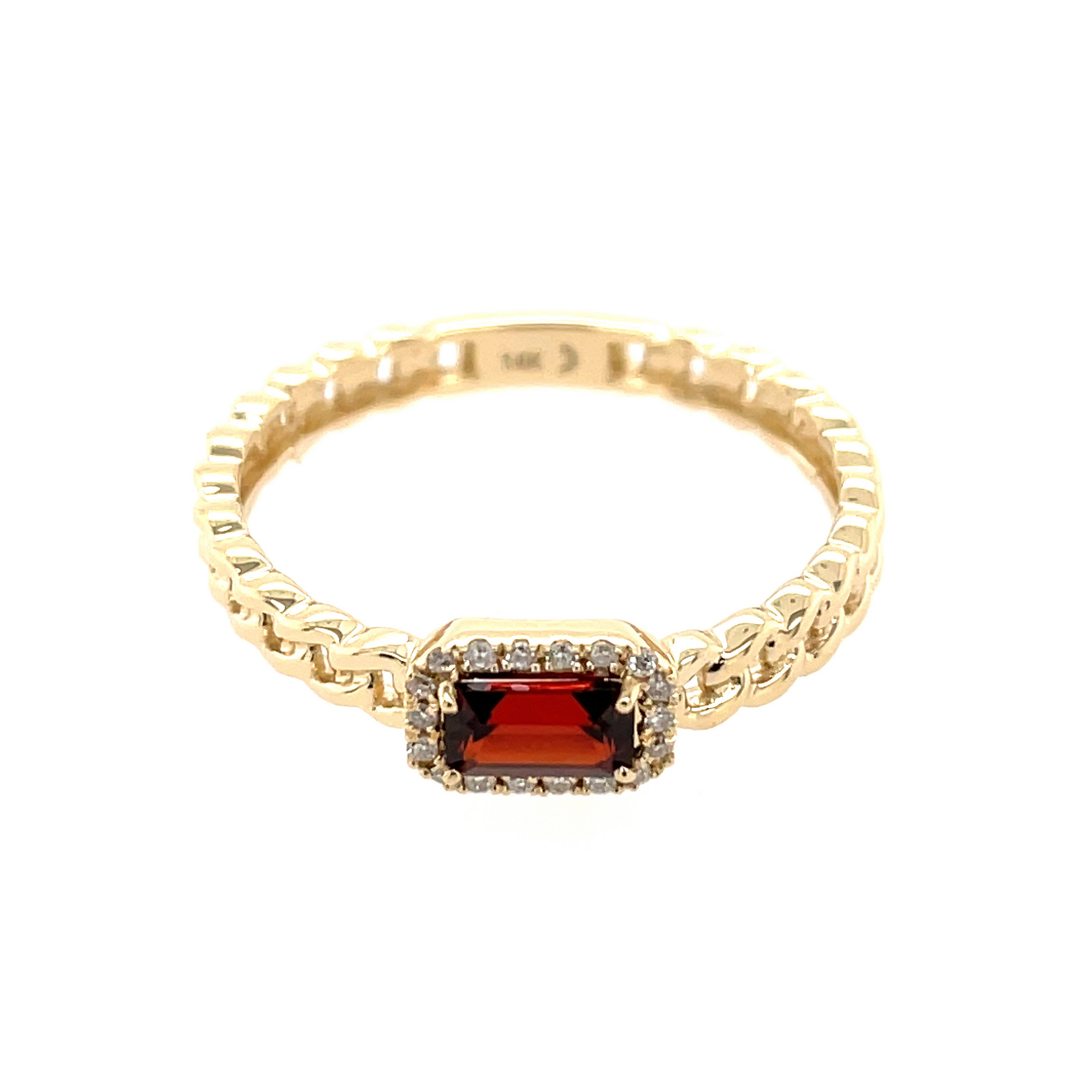 This radiant emerald cut garnet ring features a glimmering diamond halo set in 14K yellow gold. In addition, the unique gold link shank elevates the look of this elegant ring.