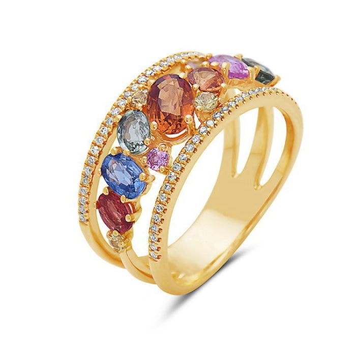 Add splashes of color to your look with this multi-sapphire band. This sparkling ring is crafted in 14k yellow gold and features a row of pave diamonds on each side of the ring.
