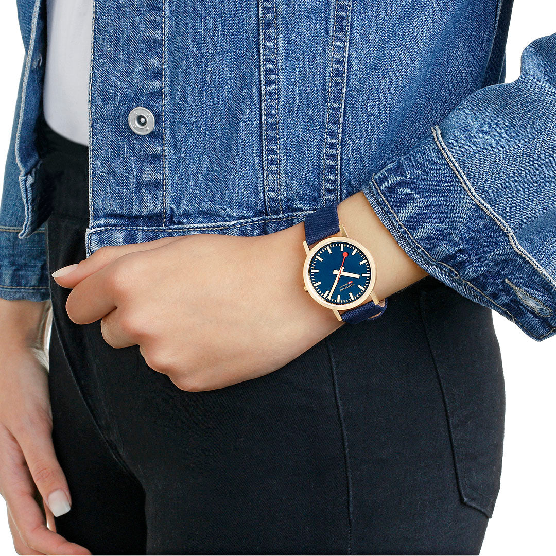 This Classic collection watch showcases a 36mm tone-on-tone stainless steel IP gold plated case, hands and markers with a polished finish to maintain the timeless design and minimalistic look of Mondaine. Featuring a Deep Ocean Blue dial and recycled PET textile strap with comfortable cork lining and stitches, this timepiece pays tribute to the wonders of our seas. Our Classic Collection comes with a clever quick-change system, allowing you to easily change your straps.